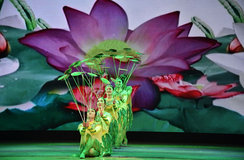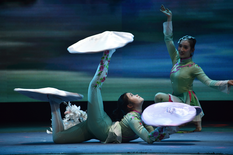 雜技《荷韻--轉(zhuǎn)碟》曾榮獲全國雜技大賽優(yōu)秀節(jié)目獎,演員們用一根長約一米,粗如鉛筆的竿子頂著碟底,晃動旋轉(zhuǎn),看上去似迎風而立的荷花,又若飛舞的彩蝶,優(yōu)美而抒情。