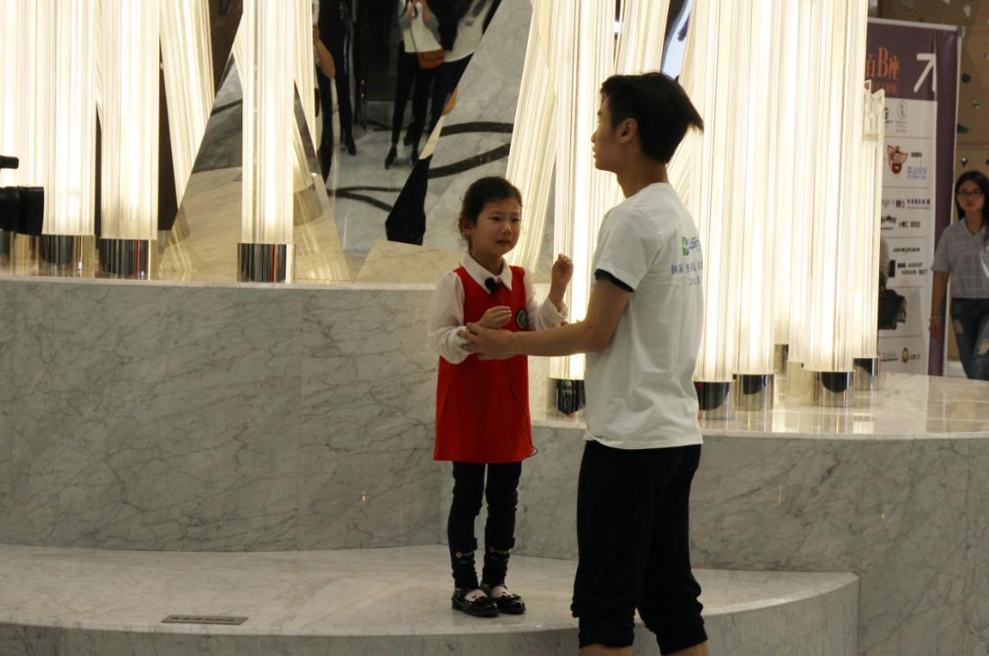 當(dāng)天晚間7點(diǎn)半左右,在南京新百商場(chǎng)的大廳,一名手系彩色絲帶的小孩,出現(xiàn)在人群中,到處尋問路人有沒有看到他的家人,十分無(wú)措。在穿梭的人群中,大家略帶驚疑卻并未在意,突然聽他大喊一聲“爸爸媽媽!”,周圍的人群迅速被他吸引過(guò)來(lái)。這時(shí),約20名左右的青年從樓梯上、服裝店里、商場(chǎng)門口迅速聚集到孩子身邊,細(xì)看不難發(fā)現(xiàn)他們每人身上都印上了一名失蹤兒童的照片及信息。隨后音樂響起,是蘇芮“親愛的小孩”,舞者們圍繞小孩紛紛起舞。行人駐足聚攏過(guò)來(lái),感受這動(dòng)人的一幕。